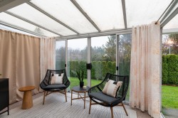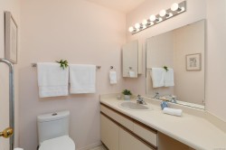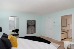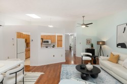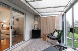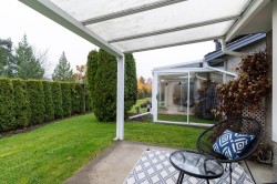 Water's Edge Village, a sought after pet friendly 55+ community offering resort style living near the ocean. This spacious 2 bedroom 2 bathroom one-level townhome with south exposure offers approximately 1280 sqft with vaulted ceilings and an open concept living & dining area with an electric fireplace, ideal for everyday comfort and entertaining. New windows, skylights and a bright year round sunroom fill the home with natural light and connect to an outdoor patio. Enjoy hardwood flooring throughout the main living spaces and a generous primary bedroom with 4 piece ensuite and a walk in closet with built in organizers. Comfort features include a heat pump for efficient heating & cooling, murphy bed and double car garage for parking and storage. Residents enjoy resort style amenities including an indoor clubhouse with swimming pool, hot tub, sauna, library, lounge, workshop, guest suite, and oceanfront walking paths, all close to shopping, medical services & public transit.