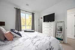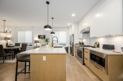 AMAZING ROOFTOP DECK! This bright 3 bed, 3 bath townhome in Burke Mountain offers a rare 600 plus square foot private rooftop retreat complete with a soothing hot tub and open mountain views. It is an inviting space for quiet mornings, outdoor meals, and evening relaxation. Inside you will find 10 foot ceilings, wide plank floors, generous windows, and a well designed kitchen with quartz surfaces, a gas stove, stainless appliances, and a large island. The upper level includes three comfortable bedrooms, a walk in closet, and ensuite in the primary. Year round comfort comes from Heat Pump and forced air heating plus a tankless on demand hot water system. A side by side garage with epoxy flooring and added storage completes this impressive home.