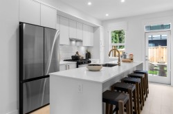 Welcome to VERSANT. A boutique collection of Modern Craftsman-inspired townhomes built by award-winning Infinity Properties. This 3-bed 2.5 bath home features a functional layout for growing families. Large kitchen with custom cabinetry, quartz countertops, SS app w/GAS range and entertaining island with eating bar. Deck off kitchen w/Gas BBQ outlet leads to a RAISED fully fenced BACKYARD. Laminate flooring on main floor, high efficiency gas furnace with AC and Rinnai water heater. Upper floor feat. 3 bedrooms incl. SPACIOUS primary bedroom w/spa inspired ensuite. Enjoy easy access to hiking trails, mountain biking routes + lakes. Only 10 minutes from the Skytrain, West Coast Express + Coquitlam City Centre Shopping + Amenities. Open by appointment only.