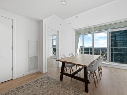 Exceptional 17th-Floor 1-Bedroom at “WEST” by Beedie. Enjoy 180-degree beautiful mountain, city, and ocean views from inside this brand-new concrete condo. Thoughtful design meets modern luxury with 9’ ceilings, custom millwork and an efficient floor plan that includes a generous bedroom plus versatile laundry/flex room. Chef-inspired kitchen showcases integrated Fisher & Paykel appliances — including gas cooktop — while air conditioning with smart thermostat keeps you comfortable year-round. Enjoy best-in-class amenities: state-of-the-art fitness centre, co-working lounge, oversized outdoor terrace, sports court and private guest suite. Outstanding location in Austin Heights connected to new Safeway and steps to cafés, shops and transit. 1 parking and 1 locker. This is it!