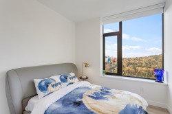 Beautifully updated 2 BED & DEN at the Alina in Coquitlam, offering an ideal location and stunning VIEWS. Professionally upgraded by A2H Design, it’s the ONLY suite with premium upgrades incl. designer lighting. Floor-to-ceiling windows frame unobstructed VIEWS of City and Mountains. The kitchen features mid-century inspired cabinetry, SS appliances incl. gas range. Enjoy a covered 220 SF wrap-around deck, split BED layout for privacy, and a DEN that can serve as a 3rd BED or office. The ensuite showcases a walk-in glass shower and modern finishes. Includes 2 Parking, Storage, access to a 6-level parkade, bike storage, EV charging, pool & hot tub. Steps to SkyTrain, shops, dining, parks and trails. BONUS: Furniture can be included with sale. Shown by appointment.