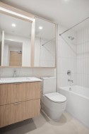 JINJU a luxurious 42-storey tower in West Coquitlam is developed and built by Anthem Properties. Located steps from the Burquitlam SkyTrain station, JINJU offers unparalleled walkability to shopping amenities, restaurants, cafes, the new YMCA community centre, and Cottonwood Park. JINJU features 25,000 sq ft of indoor/outdoor amenities, relax and enjoy the wellness spa on the 28th floor. This East facing 1 bed home welcomes in the morning sun. The open-concept L-shaped kitchen has a lemans, corner cabinet organizer and is equipped with integrated Bosch appliances, adorned with quartz countertops. Home also includes a full size LG washer/dryer. Welcome home to airy 9" ceilings and a heat pump for ultimate cooling/heating all year round. Move in ready.