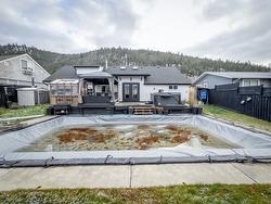 Welcome to this spacious 5-bedroom entry-level home in a prime location near schools, transit, and the Kamloops Bike Ranch. The upper level features a loft-style layout with vaulted ceilings, peak-roof windows that flood the space with natural light, a large den/office area, and a primary suite with a 3-piece ensuite boasting heated floors and a tiled shower with heated bench. The main floor offers a bright open-concept kitchen, dining, and living area with a cozy wood-burning fireplace. The kitchen boasts a gas range, and a large peninsula with bar seating and access to a generous laundry room with storage that leads to the side yard. On the main floor you will find 3 more bedrooms and a 4 pce bathroom with heated floors. Off the kitchen, step onto the outdoor deck overlooking the private backyard oasis complete with an inground saltwater pool, gazebo, grassed area, storage shed and landscaped gardens. Additional highlights include a stamped concrete driveway with RV parking, repoured garage flooring, natural gas BBQ hookup, underground sprinklers, irrigated garden beds, a crawl space and new side fencing—all just a short walk to the elementary school, dog park, and kids playground. All meas approx.
