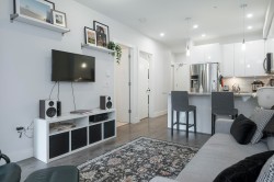 The Benjamin located in a great area of Langley City, with walkability to everything, offers this 773S/F 2 bed, 2 bath home with a spacious, open floor plan. Kitchen has gleaming high gloss white cabinetry, S/S appliances, quartz & peninsula workspace with seating for 4. A/C keeps the well sized primary bedroom cool in the hot summers & the walk-through closet leads to the 4pc ensuite. There is generous storage in the actual walk-in laundry room! There is another large bedroom & 4pc main bath. The living room leads to the oversized patio where you can walk out to the courtyard making it a quiet outdoor space! Easy access for pets & walks with an on-site fenced dog area. Amenities include a gym & community party room in this well cared for complex. 1 parking & 1 storage. Call today to view!