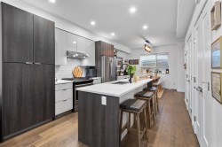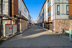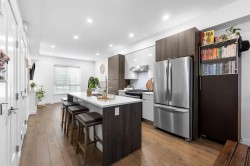 Welcome to this very clean and very well-kept 3 bed and 2.5 bath townhouse in The Terraces! The main floor offers an open-concept living room, a kitchen with a large island with a quartz countertop, and a dining area, which leads to a patio with turf. The upper floor has a decent-sized primary bedroom with its own ensuite and two additional bedrooms and a family bathroom. Additional features include central AC and hot water on demand. This centrally located complex is just a few minutes' walk to shopping, restaurants, recreation, parks, and the future new Skytrain station.Bonus EV charger, Updated Washer/Dryer, Hoodfan and hot water. Move in ready!