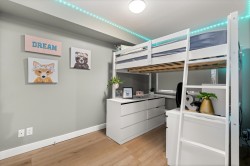 Welcome to Brydon Walk! This spacious 2 bed, 2 bath condo offers nearly 900 sq ft of bright, open-concept living in a quiet, private location on the courtyard side of the building. Enjoy vinyl plank flooring throughout, a functional kitchen with large central island, granite countertops, sit-up bar, and stainless steel appliances—perfect for everyday living and entertaining. The oversized primary bedroom easily fits a king-size bed and features a walk-in closet and ensuite. Rare dedicated laundry room with built-in shelving and upgraded Samsung washer/dryer provides abundant storage. One secured parking stall and lots of visitor parking. Professionally managed building with a new roof. Steps to Brydon Park, lagoon, trails, shopping, and the future SkyTrain. Book your private tour today!