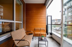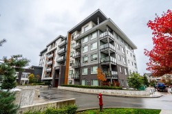 Prime Alexander Square location, steps from Willoughby Town Centre, restaurants, schools, transit, and highways. This like-new 1 bed plus den, 1 bath RDG home offers bright south-facing exposure overlooking the courtyard. The kitchen features quartz counters, Whirlpool stainless steel appliances, washer/dryer, microwave, and a Mysa smart thermostat. The bedroom and walk-in closet are carpeted for comfort. Parking access via 80th St. and through the adjacent townhouse with fob entry to the two-level parkade. Amenities include a gym, lounge, rooftop deck with BBQs, courtyard with fire pits, and community garden plots. Well-run strata includes hot water and caretaker, offering move-in-ready comfort and convenience.