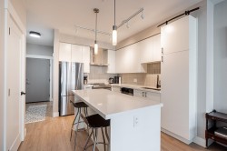 Welcome to this modern and thoughtfully designed 1 bed+den unit, offering 661 sqft of comfortable living in the heart of Willoughby. Situated on the quiet inside of the third floor, this unit provides a bright and functional open-concept layout that maximizes every inch of space. Enjoy cooking in the full-size kitchen featuring sleek cabinetry, quartz countertops, and stainless steel appliances. The generous living area opens to a private balcony, ideal for relaxing or entertaining. The versatile den is perfect for a home office, nursery, or extra storage. This home includes ample closet space, in-suite laundry, and access to Hudson & Singer’s lifestyle amenities, including a courtyard, lounge, and communal workspaces. Located steps from Willoughby Town Centre, schools, parks, and transit.