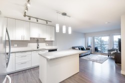 EDGE ON EDGE - Immaculate South-East facing, bright 4th floor 1 BED+PLUS DEN /1 Bath suite in the popular Edge on Edge built by Maclean Homes! Open concept floor plan features 8' ceilings, granite counters, undermount sinks, kitchen w/shaker cabinets & S/S appliances. Large master with walkin closet & cheater ensuite. Front loading in-suite laundry & large den/office space. Covered deck with street parking all around, secure underground parking, 2 pets & rentals allowed! Steps to Shopping, Transit, Restaurants, Rec Center, gyms and Schools! Call today to book your showing!