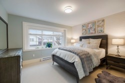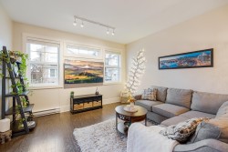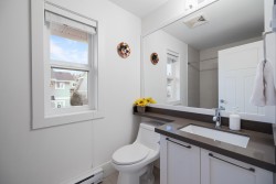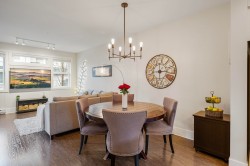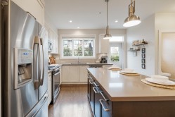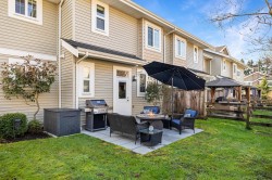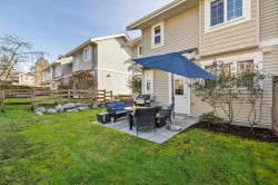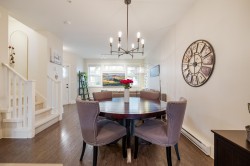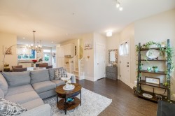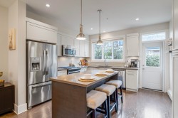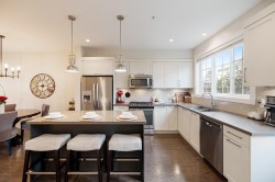 TWO STOREY LIVING in sought after Village Green! This corner unit is perfect for entertaining, and the bright spacious open concept layout gives you that warm inviting feels the moment you walk through the door. Featuring 9-foot ceilings, a spacious kitchen with quartz counters, gas stove and an oversized island that overlooks the living and dining room makes this home ideal for social gatherings! Upstairs you’ll find 3 bedrooms, 2 baths and full-size laundry. The primary bedroom hosts an ensuite with an oversized shower with glass door and dual sinks. Other features include private driveway, storage, large fully fenced backyard with patio, gas hookup for the BBQ and a playground for kids. Located close to schools, transit and shopping. Open House Feb. 14, Sat 1-3 PM