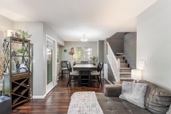 WELCOME TO ABERNETHY LANE! This BRIGHT and WELL-MAINTAINED 2-LEVEL END UNIT townhome features 3 LARGE BEDROOMS plus a FLEX/DEN area and 2.5 BATHROOMS. Enjoy a SPACIOUS layout with an UPDATED KITCHEN, OPEN-CONCEPT LIVING & DINING areas, and a COZY GAS FIREPLACE. Upgrades include a NEWER WASHER & DRYER, FRIDGE, and DISHWASHER (2021). The PRIMARY BEDROOM offers VAULTED CEILINGS and ample closet space. Includes 2 PARKING SPACES, one in the SINGLE-CAR GARAGE. Located in a FAMILY-FRIENDLY complex near SHOPPING, SCHOOLS, TRANSIT, AMENITIES, and the ABERNETHY CONNECTOR. A FANTASTIC HOME in a GREAT LOCATION!