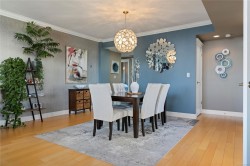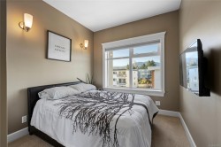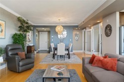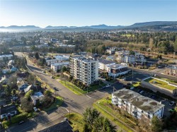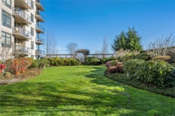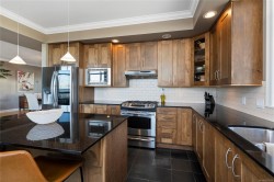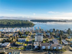 Breathtaking ocean views at Marine Vista, one of Nanaimo’s most prestigious and impeccably maintained concrete residences. From the elegant lobby to the peaceful, grassed courtyard, the building exudes luxury, privacy, and pride of ownership. This spacious 2-bedroom plus den, 2-bath home showcases stunning ocean, marina, and mountain views from two decks. High ceilings and expansive windows fill the home with natural light, highlighting its modern design and refined finishes. The chef-inspired kitchen features stainless steel appliances, abundant cabinetry, and generous counter space. A patio sliding door leads to a large covered deck, and there is a 2nd private deck off the primary bedroom. The primary suite includes a spa-like ensuite with double sinks, separate shower, and luxurious bathtub. A versatile den is ideal for a home office or studio. 2 underground parking stalls and small storage locker, gas heating and cooking are included in the strata fee. All data and info approximate