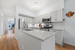 Unique 2-level townhome in a boutique English-style complex on a peaceful no-through street. This home stands out for its rare large backyard directly off the main level, superb walkability, functional layout and privacy. Inside you’ll find 9 ft ceilings, new flooring, and a bright family room with walkout access to a private patio and fenced yard, ideal for kids, pets, gardening, or morning coffee and evening wine. A cozy living room with gas fireplace and dedicated dining area add great usability. Upstairs are 2 bedrooms plus a skylit den perfect as an office, nursery, or 3rd room. Features include 2 secure underground parking stalls, front and lane access, and recent building repiping. No presentation of offers until December 17, 2025 at 4:00pm.