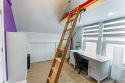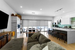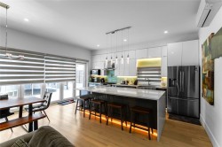 Gorgeous 3 level home w/excellent street appeal situated on the high side of the street. Unique custom design boast 10' ceilings on both levels w/the top flr being vaulted. Entertain in the great rm w/open living/dining, kitchen which has luxury lacquer cabinets incl 10' island w/ bar fridge. Samsung appliance package w/pot filler. 19' Bifold Patio Doors spills out to the patio to enjoy the fenced backyard. Dining rm has warm raised gas F/P w/ built-in shelving, desk. Comfort with air con, radiant flr heat. Your kids will love their secret play rm, loft. Engineered H/W flrs, Italian tile walled master br 7-pce ensuite. Smooth transition walk-in showers w/frameless glass doors. Convenient mud rm. 2 br separate entry legal basement suite. Detach double garage w/level 2 EV charging plug.