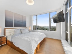 Sub-Penthouse with Spectacular Views. From your expansive northeast-facing balcony, enjoy an unencumbered mountain panorama from Mt. Baker to Horseshoe Bay, with expansive, green space below and sunrises over the Fraser River that fade into brilliant sunsets across the city. A $250,000 renovation has transformed this home into a calm, modern retreat with marble-clad bathrooms, heated floors, a Jacuzzi tub, built-in fireplace, integrated sound system, and a custom espresso bar for easy mornings. The primary suite features dual custom closets and a serene ensuite, while a versatile den with Murphy bed offers space for guests or a home office. Steps from Queen’s Park and Glenbrook Ravine, this home blends natural beauty and city living. Open House Saturday, December 20th from 1-3 pm.