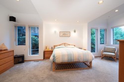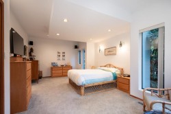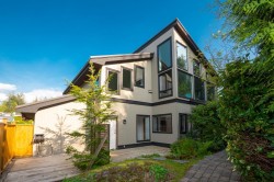 Thoughtfully designed with a reverse living plan to capture sweeping ocean views, this stunning residence offers 4 bedrooms and 4 bathrooms across three beautifully appointed levels. The home features a dedicated office, inviting family room, and abundant storage throughout. Soaring vaulted ceilings, expansive picture windows, and skylights bathe the interiors in natural light, showcasing the surrounding forest and mountain vistas. With over 1,000 sq. ft. of sun-drenched decks and patios, this is truly an entertainer’s dream. A rare, large flat driveway accommodates up to six vehicles in addition to a two-car garage. Backing onto a private greenbelt and just a short stroll to parks and beaches, this home offers the perfect blend of tranquility and coastal convenience.