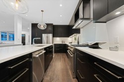 A completely redesigned FOUR bedroom + office, 4 bathroom duplex-style townhouse offering nearly 3,000SF of thoughtfully curated living. Soaring vaulted ceilings, skylights & wide plank hardwood floors enhance the open concept main floor, French double doors leading to a large PRIVATE fenced yard w/ built-in Weber BBQ island. Chefs kitchen fts. 10-ft quarts waterfall entertainers island, black oak cabinetry, ample storage, Jennair S/S appliances & a built in banquette. Stunning steel+glass staircase leads to 3 light filled bedrooms & an impressive primary suite with lofted office, vaulted ceilings, walk-in closet & ensuite w/ soaker tub, walk-in shower, double vanity and in-floor heat. Lower level includes a media room, gym, & a fully finished nanny suite w/ separate entry & 2 car garage.