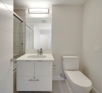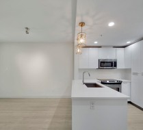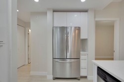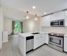 Bright and modern, fully renovated 1-bedroom + spacious den with an open layout and private balcony facing a nice, quiet creek and backing onto a peaceful green space—perfect for year-round privacy & relaxation. Features over-height ceilings, radiant in-floor heating (heating is included into the maintenance fees), wide-plank laminate flooring, quartz counters, and stainless steel appliances. The den is ideal for home office or reading nook. The Shore offers well-equipped gym, party room, yoga studio, playground. Enjoy local favourites like Italian Vomero Coffee House and Thomas Haas just steps away. Walkable location near shops, trails, transit, only 10 minutes to Lonsdale Quay via Spirit Trail. Includes 1 parking, 1 locker. Pets and rentals allowed!