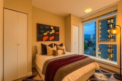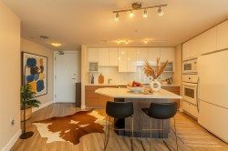Welcome to Ventana, a premier concrete residence in the heart of Lower Lonsdale. This bright 2 bed, 2 bath corner suite offers 800 sqft with floor-to-ceiling windows framing harbour, city mountain views. The open layout features a modern kitchen with quartz counters, sleek cabinetry gas cooktop, flowing into a light-filled livingdining area with access to a private balcony. The spacious primary bedroom includes dual closets a 4-piece ensuite, while the second bedroom is perfect for guests or a home office. Building amenities include a fitness centre, lounge, bike storage caretaker. Comes with 1 secure parking, storage locker visitor parking. All this just steps to the Shipyards District, Seabus, Lonsdale Quay, shops dining.
