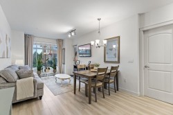 Welcome to Cedar Downs, one of Pitt Meadows' most sought-after condo communities! This beautiful 2 bedroom + den unit impresses from the moment you walk in, featuring a bright open concept layout with 9 ft ceilings and expansive windows that fill the space with natural light. Both bedrooms are spacious primaries with walk-in closets and spa-inspired ensuites complete with heated floors, fog-free mirrors, and a soaker tub/shower combo. Enjoy a cozy covered patio perfect for morning coffee or evening BBQ's, built-in A/C in both bedrooms, two parking stalls, and a huge 10x10 roll-up storage locker right next to your parking spot. Steps to the West Coast Express, shops, restaurants, schools and trails, come enjoy the best of Pitt Meadows living! OPEN HOUSE SAT NOV 15 12PM-2PM