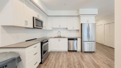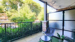 Welcome to LUMIERE, a NEWER DEVELOPMENT in the heart of Downtown Port Coquitlam!! Well laid out open concept 1 bedroom & den & 1 bathroom GROUND LEVEL unit!! Kitchen has quartz countertops, breakfast bar, stainless steel appliances & white shaker cabinetry w/under mounted lighting. Beautiful 12mm laminate flooring throughout with TJI silent floor system. 9' ceilings throughout for an open & airy feeling. Roughed In Central Vacuum, Smart Thermostat. Large 96sf covered PATIO for your entertaining. Close to transit, schools & Westcoast Express with Gates Park just a block away!! Walk to the new PoCo Recreation Centre!! Pet & rental friendly building. 2 Recreation Rooms for entertaining!! Wheelchair friendly. 1 parking stall included w/several bike rooms. 4 EV Charging Stations in building!!