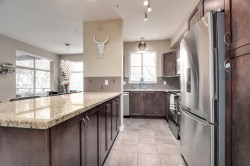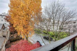 Largest home in the building! Stunning 1,214 sq.ft. NW corner condo surrounded by greenery and natural light. 9' ceilings and an open, modern layout create a bright, airy feel. Stylish kitchen with large island flows into spacious living & dining areas-perfect for entertaining. 2 bedrooms plus den offer ideal space for living, working & relaxing. Updated with vinyl flooring, fresh paint, lighting, washer/dryer, fridge, dishwasher & microwave. 1 parking, insuite storage, guest suite, proactive strata. 2 pets ok (dogs under 20kg, no bully breeds). Prime downtown Port Coquitlam location-steps to shops, cafes, and trails along Coquitlam River. A rare find when nature & convenience meet!