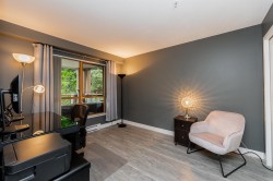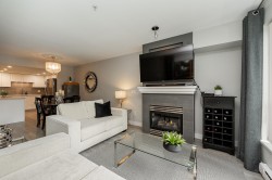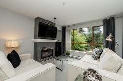 BEAUTIFULLY RENOVATED Port Moody condo in the sought-after Belcarra at Newport Village! This 2 bedroom, 2 bathroom CORNER UNIT overlooks a peaceful courtyard and features a spacious, open layout. The completely redone timeless kitchen offers shaker-style floor-to-ceiling cabinetry, an island, and quartz counters. The living room includes a cozy gas fireplace, and opens to a private, covered, south-facing balcony with serene courtyard views. Bedrooms are generously sized and separated for privacy. The primary fits a king bed, and features a walk-in closet and 3-piece ensuite. Updates include kitchen, bathrooms, flooring, lighting, doors, baseboards, and fireplace surround. Comes with 2 parking and a locker. Steps away from shops, Rec Centre, SkyTrain, Brewery Row, and Rocky Point Park.
