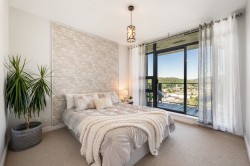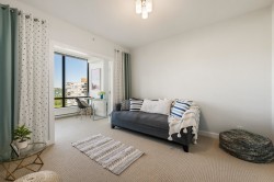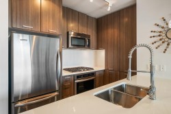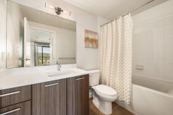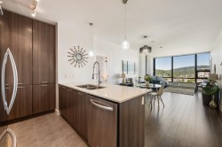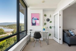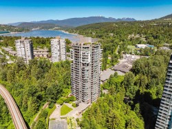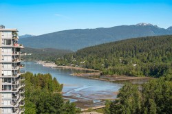 Enjoy WATER & MOUNTAIN views from this 2 BED/2 BATH + DEN/OFFICE luxury condo on the 22nd floor. An open plan with floor-to-ceiling windows brings tons of natural light during daytime + city lights at night. Walk-in closet, S/S appliances, quartz counters, gas cooktop, breakfast bar & plenty of storage. Recently renovated, upgrades include LED light fixtures, accent wall & new paint throughout. 2 parking stalls, 1 storage, access to 5 EV charging stalls + opportunity for your own private EV charging. Amenities: gym, yoga, sauna, steam room, tennis court, conference room, concierge, theater/party room, outdoor BBQ & guest suites. Close to Inlet Skytrain station, dog park, restaurants, Rocky Point park, trails, schools & Brewers Row.