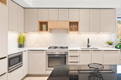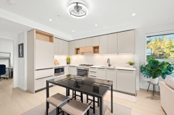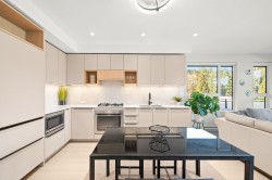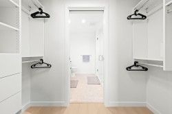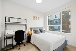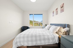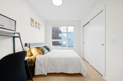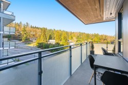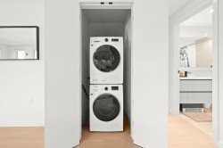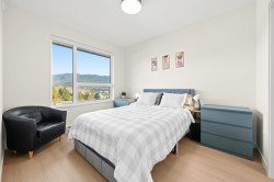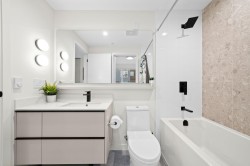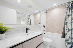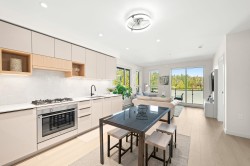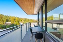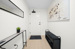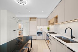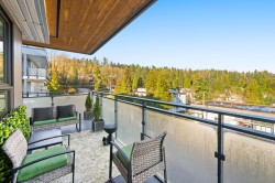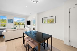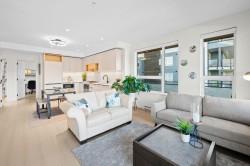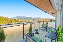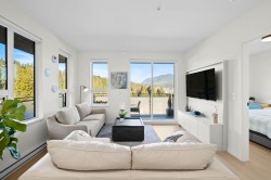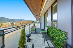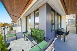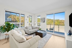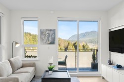Rare top floor corner 2-bedroom, 2-bathroom home at Hue by Marcon with a 181 sq ft wraparound patio and sweeping mountain and inlet views. This home offers a bright, open layout with windows on multiple sides, providing excellent natural light and a quiet top-floor setting. The well-designed floorplan places the bedrooms on opposite sides for added separation. The kitchen features a paneled Liebherr refrigerator, Fulgor Milano dishwasher, AEG gas cooktop, and electric wall oven, complemented by wide plank natural oak laminate flooring. The primary bedroom includes a walk-through closet leading to a private ensuite. One EV-ready parking stall and one storage locker included. Amenities include a rooftop patio, fitness centre, co-working lounge, children’s play area, and dog wash.