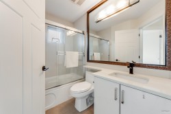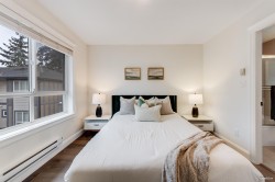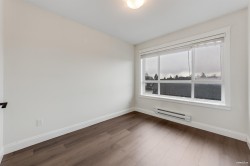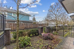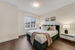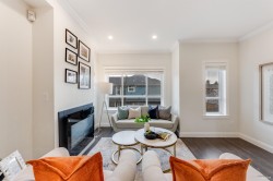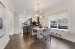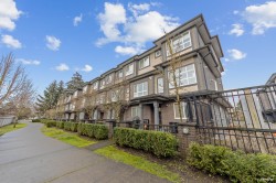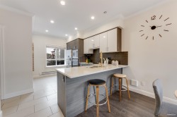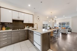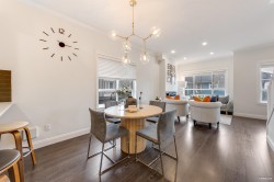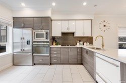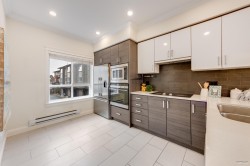 Welcome to RIGA, a collection of luxury townhomes in a highly sought-after central location. This rare corner unit enjoys exceptional natural light with south, North, and west exposure. Beautifully maintained and thoughtfully designed, this home features 3 spacious bedrooms and 2.5 bathrooms. The functional open-concept layout boasts 9' ceilings on the main floor and a gourmet kitchen complete with sleek cabinetry, quartz countertops. Elegant details include extensive crown moulding, a designer color, a designer color palette, a modern gas fireplace, and quartz surfaces in both the kitchen and bathrooms - blending comfort with contemporary style. Located in a top-ranking school catchment for DeBeck Elementary and Palmer Secondary, and just minutes from shopping, restaurants, schools, trans