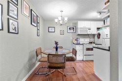 OPEN HOUSE SAT DEC 20, 2025. NEW PRICE! You will love this well cared for bright west facing 1 bed 1 bath updated condo! Updated features include newer style kitchen cabinets, laminate floors & newer carpet in living room. Great outlook over beautiful Rutledge Park out to the mountains beyond. You will also enjoy incredible year around views from the balcony. Pet friendly 1 dog under 25 lbs & 1 cat or 2 cats. Centrally located between Hillside Mall and Mayfair Mall, Thrifty Foods, Save on Foods, 1 block from direct bus route. Proactive strata in a well managed building. Come & see this great condo and make your wise choice today to live in this quiet convenient location.