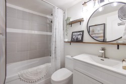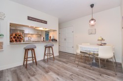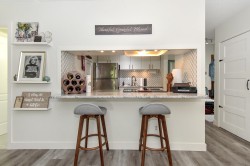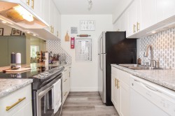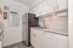 Renovated Corner Unit with 20’ x 19’ wrap-around balcony. This updated pet friendly, open layout, 2-bedroom, 1-bath corner unit offers direct access with a easy side entrance. Located in downtown Cloverdale, features modern flooring, soft closing kitchen cabinets, a deep bathtub, dual shower heads, and ample vanity storage. The spacious primary bedroom boasts room for a King sized bed and walk-in closet with custom shelving and drawers. The second bedroom fits a Queen sized bed. Enjoy the convenience of in-suite laundry, underground parking with fob entry, and fiber optic internet. Steps to amenities like groceries, medical, fitness, and shopping. Development potential in this evolving area makes this a smart investment for rental or primary living.