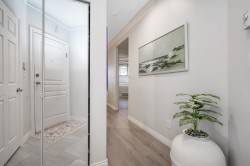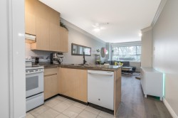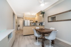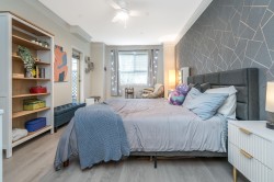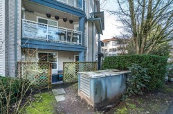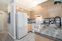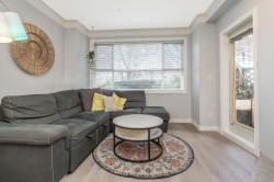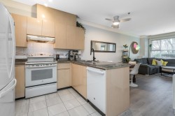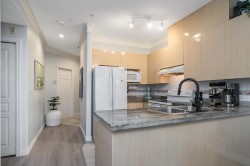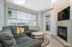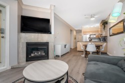 Welcome to The Crossing! Ground-floor corner two-bedroom ideally located near the entrance and elevator. Bright, spacious , functional layout with granite kitchen counters and a cozy gas fireplace in the living room. Beautifully renovated bathroom with cheater ensuite access from the spacious primary bedroom and walk-in closet. Private patio off the living area. Includes one parking stall and one storage locker. Pet-friendly building. Close to shopping, restaurants, parks, transit, and major routes