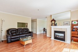 This delightful corner unit offers 2 generously sized bedrooms in a desirable Guildford neighborhood. The spacious living room features a large window that fills the space with natural light, while a cozy gas fireplace creates a warm and inviting atmosphere for gatherings during cooler months. The efficiently designed kitchen makes meal prep effortless, and the living room flows seamlessly to the dining with a sliding door leading to one of the two balconies—perfect for enjoying morning coffee or evening sunsets. The primary bedroom is spacious and includes its own balcony. Beautiful location, this home allows you to walk to nearby amenities, including T & T Market, Guildford Mall, schools... Few minutes drive to rec. center, pool, library & HWY 1.Open House Saturday, December 20, 2-4 PM