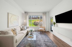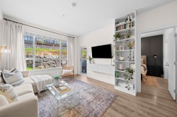 Welcome to The Ridge at Bose Farms-here countryside charm meets elevated,turnkey living. This bright and beautifully maintained east-facing 1 bed,1 bath home offers an open concept meticulously maintained floorplan ft. 9"" ceilings, wide plank floors,fresh paint,custom built-ins, and elegant wall detailing throughout. The spacious primary bedroom is a true retreat with a striking feature wall and large walk-in closet with walk through 5 pc bathroom. The open-concept layout flows into a stylish kitchen with white shaker uppers, rich wood-tone lowers, quartz counters, and stainless appliances. Enjoy your covered patio year round, peaceful outlook, and resort-style amenities including gym, theatre, gardens, and guest suites. Pets and rentals allowed. 1 parking, 1 storage. Close to everything.