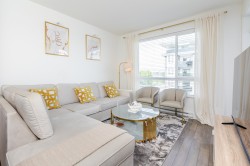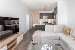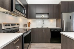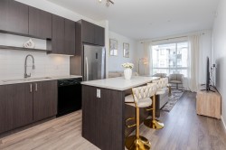 Welcome to Kings Landing by Dawson & Sawyer - This pristine 1 bed, 1 bath plus den unit boasts of contemporary open living space. Bright and open concept featuring 9' ceilings, dark shaker cabinetry with designer stainless steel hardware, quartz countertops, durable laminate flooring & stainless steel appliances. Unit includes 1 underground parking, amenities room & bike room. Prime location - conveniently located near Skytrain, SFU Surrey, future UBC campus, shopping, recreation, restaurants, and much more! Rentals and Pets allowed (1 cat or dog), Perfect for investment or first time buyers.