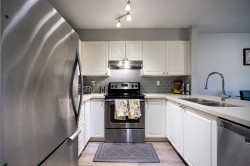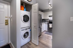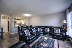 Completely updated 2 bed, 2 bath home with 2 parking! Centrally located and move-in ready, this spacious unit features a large open-concept kitchen with quartz counters, updated baths, cozy gas fireplace, and in-suite laundry. Enjoy an oversized 120 sq.ft. covered private deck with partial views, perfect year-round. Generous rooms fit full-sized furniture with ease. Upgrades include laminate floors, appliances, designer paint, and fireplace surround. Well-maintained complex offers a party room and modern gym, all with a low maintenance fee. Walking distance to Newton Bus Exchange, transit, shops, restaurants, and entertainment! Open House Nov 1 & 2 from 1:00 to 3:00