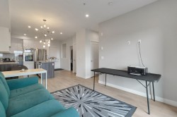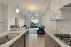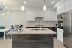 Welcome to AMSON SQUARE, situated in the vibrant heart of East Newton. This 2-bedroom, 1-bathroom unit offers 687 sq ft. + balcony, crafted for modern living. The open-concept layout features 9 ft ceilings, pot lights, and an energy-efficient air conditioning. Enjoy laminate flooring in the living/dining areas, cozy carpet in the bedroom, and sleek zebra window coverings. The kitchen boasts a waterfall island, quartz countertops, premium stainless steel appliances, and a gas stove. Outdoor amenities include a rooftop patio with a BBQ area, a party hall, and a kids’ play area with stunning mountain views. Local shops are right on the main floor of the building, bus stop is right in front of the building. A few minutes away from Newton Exchange, grocery stores, and restaurants.