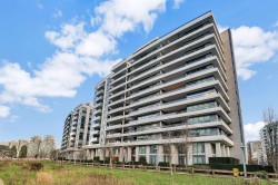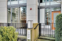 Welcome to Navio South by Concert Properties. This refined parkside 2-level townhome offers bright, open-concept living with 2 beds and 3 full baths. Overheight ceilings, A/C, and engineered hardwood enhance the modern design. The chef’s kitchen showcases full-size Bosch appliances, quartz waterfall countertops, and an oversized island with seating. Living and dining areas extend to a private patio, perfect for summer entertaining. Upstairs, the primary retreat features generous closets and a spa-inspired ensuite with heated floors. A spacious second bedroom and versatile flex area complete the home. Steps to the False Creek Seawall, parks, dining, and SkyTrain. Open House Sat & Sun, Feb 28 & Mar 1, 2-4pm