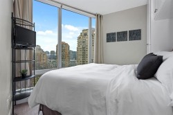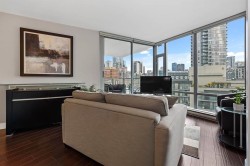 Chic 1 Bedroom and Den at the ELAN by Cressey. Bright and spacious layout with no wasted space. Floor to ceiling windows showcasing lovely city/park views + peeks of Northshore Mountains & BC Place lights show! Laminate floors, quartz counters + stainless appliances. Large square balcony. Great flex room doubles up as home office + pantry. Meticulously kept luxury tower, with great resident caretaker, cardio/weights rooms, sauna/steam, party/games/meeting rooms. Parking stall, large locker + guest parking. 2 cats/dogs welcome (any size). A stone's throw to Yaletown, 5 mins walk to shops and great restaurants, Sea Wall, Canada Line to YVR.