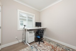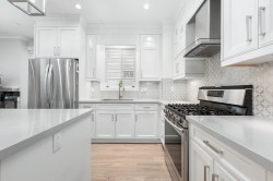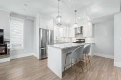 This beautifully designed 1/2 duplex offers 4 bedrooms, 3.5 bathrooms, and 1,522 sq ft of bright, contemporary living across three levels. The main floor showcases a stunning white kitchen with quartz countertops, stainless steel appliances, custom cabinetry, and a large island ideal for entertaining. Open living and dining areas are complemented by high ceilings, wide-plank flooring, and abundant natural light. Upstairs features a spacious primary bedroom with ensuite plus two additional bedrooms. The lower level includes a flex/family room and bedroom with excellent potential for a mortgage-helper suite. Complete with a private patio, garage, and quality finishes throughout, this move-in-ready home offers exceptional value and versatility.