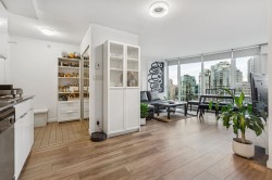 Spacious NW facing 1 BED & FLEX w/balcony home offers over 600 SF of bright urban living w/gorgeous city views. Unit is very well kept inside, also new floors, washer/dryer. Sleek linear kitchen w/stainless steel appls/backsplash & smooth cooktop. Full height windows provide lovely natural lighting or have a seat on your balcony to watch the sunset over the city. TV TOWER by Concord Pacific has concierge, cardio/weight rooms, steam/hot tub, meeting rm, party lounge w/pool table & theatre. PRIME D/T CORE - steps to the stadiums, Seawall, restaurants, transit, library & new Amazon offices & City Market. Excellent city home to live or invest in. 1 parking.
