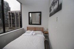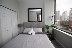 Large bright one bedroom and flex corner unit in a solid building! This unit features 9'10 ceilings and a good sized balcony. Steps to shops and services on the entertainment district on Granville St. with easy access to major transit. Strata friendly to short-term rentals.