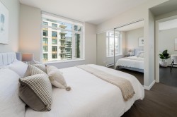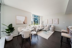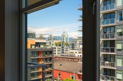 VIEWS! Welcome to the prestigious Wall Centre in Olympic Village—this spacious 1 bedroom + den, 1 bathroom home is a rare offering. Solid concrete construction with an entertainer’s kitchen featuring premium cabinetry and appliances. The bright living and dining areas are filled with natural light and open to a generously sized balcony. Maintenance fees include gas, hot water, and full access to amenities. Enjoy 5-star amenities including a gym, party room, and guest suite. Unbeatable location steps to the seawall, waterfront, dining, shops, SkyTrain, and Science World. Pets and rentals allowed. Includes one parking. Sneak Peek Sat Feb 14th 12-12:15pm, Open House Sun Feb 15th 3-4pm