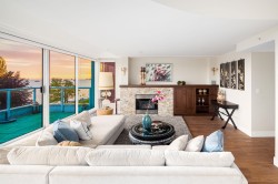RENOVATED WATERFRONT Penthouse! Unobstructed Panoramic Ocean View on both levels! This luxurious 3150 sf suite offers 4 bedrooms, 3 full bathrooms, a gourmet kitchen with top of the line appliances (6 burner gas stove) and 2 offices, all interlocked by an elegant spiral staircase separating the two floors. Master suite occupies the entire 2nd floor w/spa like ensuite, an enclosed balcony, a sitting area and a private office. Building envelopes upgraded in 2024! Enjoy the blue satin waters of English Bay on the balconies. 3 parkings.