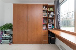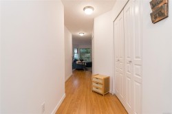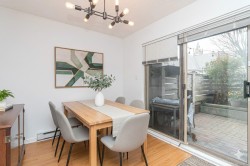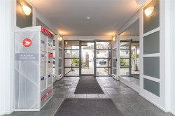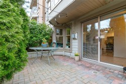 Bright & spacious 2 bed, 2 bath corner unit in the heart of downtown. The entry leads into a generous living room anchored by a newer gas fireplace, creating a warm and inviting space to relax or gather with friends. The separate dining area is ideal for hosting & flows seamlessly onto an exceptionally large, interlocking brick patio surrounded by greenery. The kitchen features stainless steel appliances, modern quartz countertops & ample storage. The spacious primary bedroom offers an escape with a private ensuite complete with a tub and updated quartz vanity. The second bathroom is just as updated with a shower instead. The additional bedroom includes a custom Murphy bed with a built-in desk, providing excellent flexibility for guests or a bright, practical home office. The laundry room has additional storage. Complete with secure parking and a storage locker, this pet-friendly building welcomes a larger dog and/or cats. All just steps to restaurants, cafés, shopping & amenities.