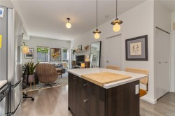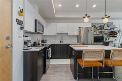 Welcome to this bright ground-floor condo at the Horizon in the Railyards, offering a rare 425sqft private patio! This award-winning contemporary building is set in a vibrant waterfront community that blends natural beauty with urban convenience. The fully rentable and pet-friendly suite features a modern kitchen with stainless steel appliances and quartz countertops, opening into a sunlit living and dining space with southwest-facing windows. Everyday comforts include in-unit laundry, a designated parking stall, separate storage, bike storage, and paddle board/kayak storage in building. Residents also enjoy access to a rooftop patio with sweeping city and waterway views. Just steps outside your door you can walk, kayak, or cycle downtown in minutes, or explore the parks and shops right across the street. With the Galloping Goose Trail, Selkirk Trestle, and Gorge waterway at your doorstep, this home is perfect for those seeking both an active lifestyle and a connected urban experience.