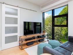 Welcome to The Wade—a sophisticated, 2021-built low-rise steel and concrete building that combines modern design with lasting quality. This top-floor corner unit offers over 750 sqft. of bright, thoughtfully designed living space with large windows & serene park views. Open-concept layout features a gourmet kitchen with quartz countertops, stainless steel appliances including a gas cooktop, two toned full-height modern cabinetry & large island with an eating bar—perfect for entertaining. Primary bedroom includes walk-in closet and ensuite with heated tile floor. Additional highlights include in-suite laundry, second full bathroom with heated tile floors, private balcony with a gas BBQ hookup and abundant natural light throughout. Enjoy access to a stunning rooftop terrace with sweeping city views plus your own garden plot and private peaceful courtyard. Well run strata welcomes 2 dogs (any size) with access to secure underground parking, separate storage locker & bike room.