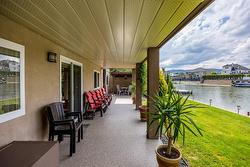 professionally renovated 3-bedroom walkout rancher offers over 3,600 sq. ft. of luxurious living space. The bright, open floor plan flows seamlessly from the gourmet kitchen, boasting a granite island, custom wood cabinetry, stainless steel appliances, and a gas range to the inviting living areas with maple hardwood floors. The main level features a sophisticated master suite, a private office, and an inspiring art studio. Downstairs, a spacious family room, and a convenient guest or in-law suite complete with its own laundry and private entrance provide ample flexibility. Enjoy modern amenities like a Navien instant hot water system. Heading outside, you are welcomed by captivating views of the canal waterway and the picturesque Mission Hill Winery bell tower. Outdoor entertaining is a dream with a covered patio, a charming timbered pergola, a main level deck, and a beautifully landscaped, east-facing front courtyard. And as expected with a property on the waterway, this home on prestigious Pritchard Drive offers a newer dock with 4000 lb electric boat lift for your private moorage. With an impressive front entry, a double garage, covered pergola carport, this is an unparalleled opportunity to embrace the best of Okanagan living. New roof.