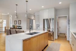 The main floor features a bright open concept kitchen with high end finishes and oversized windows that flood the home with natural light. The primary suite is conveniently located on the main level and offers a spa inspired ensuite with generous proportions. An office, laundry room, and covered deck complete the main floor and enjoy peaceful morning sunrises.